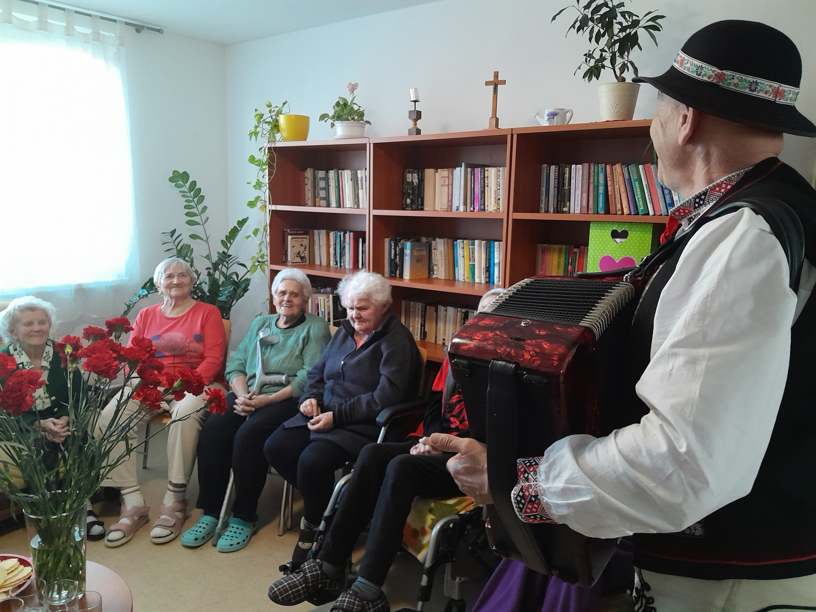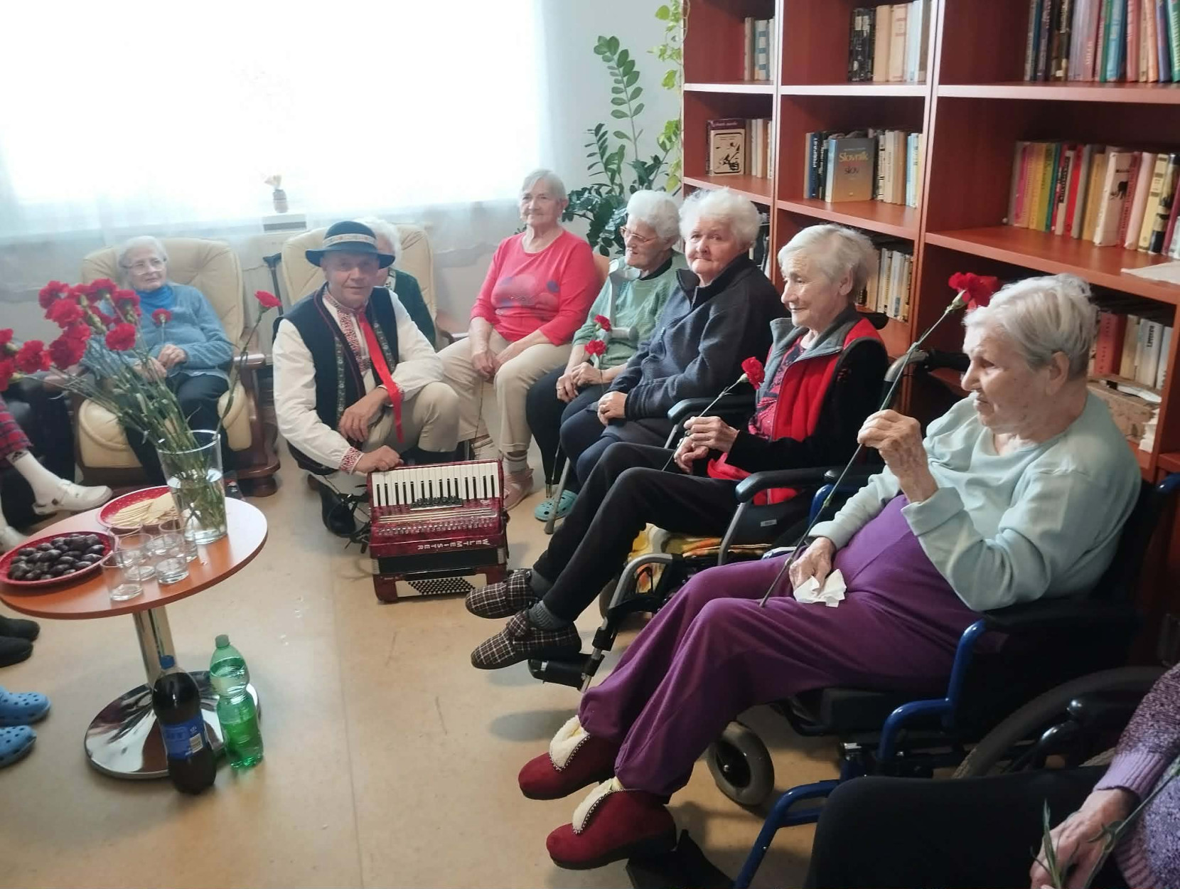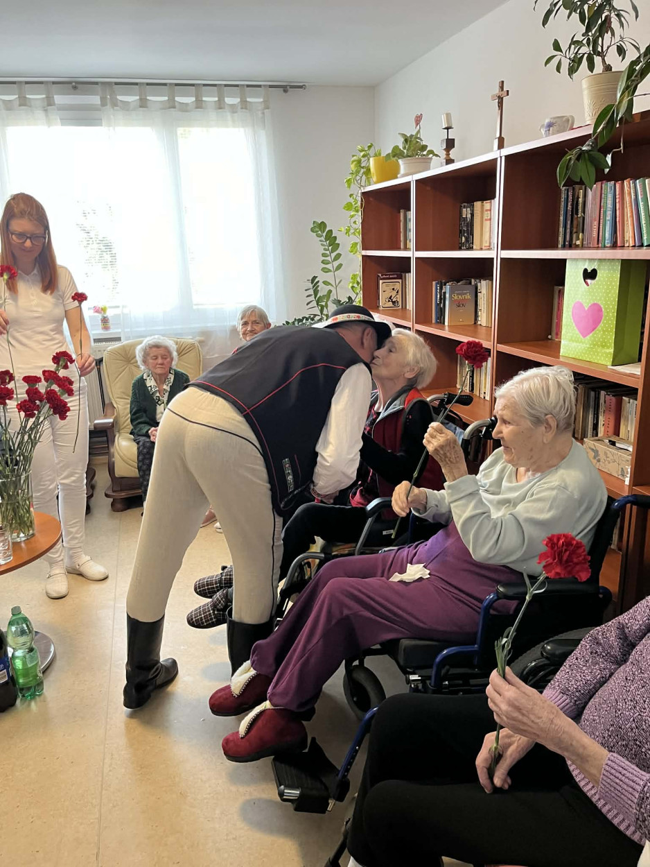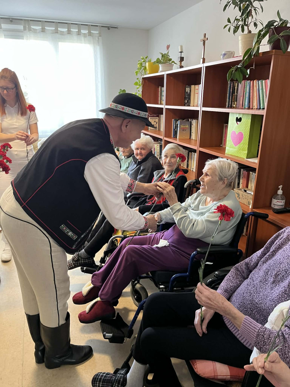 Dňa 9. marca 2026 sme v našom zariadení prežili príjemné a srdečné dopoludnie venované našim prijímateľkám sociálnej služby pri príležitosti Medzinárodného dňa žien. Tento sviatok sme oslávili spoločným posedením, ktoré sa nieslo v duchu radosti, hudby, smiechu a dobrej nálady. Pozvanie medzi nás prijal pán Peter Jendrišák, ktorý nám svojim spevom a hrou na harmonike spríjemnil celé stretnutie. Spoločne sme si zaspievali množstvo krásnych a známych ľudových piesní, ktoré našim prijímateľkám pripomenuli mladé roky a vyčarili úsmev na ich tvárach. Medzi piesňami nás pán Jendrišák rozveselil aj rôznymi veselými príhodami a vtipmi, pri ktorých sa miestnosť naplnila smiechom a príjemnou atmosférou. Na záver tohto krásneho vystúpenia pán Peter venoval každej prijímateľke červený karafiát, ako symbol úcty, vďaky a pozornosti ženám. Po spoločnom obede sme následne navštívili aj prijímateľky na izbách, aby sme červené karafiáty odovzdali aj tým, ktoré sa posedenia nemohli zúčastniť. Aj takýmto spôsobom sme chceli potešiť všetky naše dámy a spríjemniť im tento výnimočný deň. Ďakujeme pánovi Petrovi Jendrišákovi za krásne hudobné vystúpenie, dobrú náladu a čas, ktorý venoval našim prijímateľkám. Veľmi si to vážime a všetkým našim milým prijímateľkám prajeme najmä veľa zdravia, pokoja, radosti a čo najviac krásnych chvíľ prežitých s úsmevom na tvári.