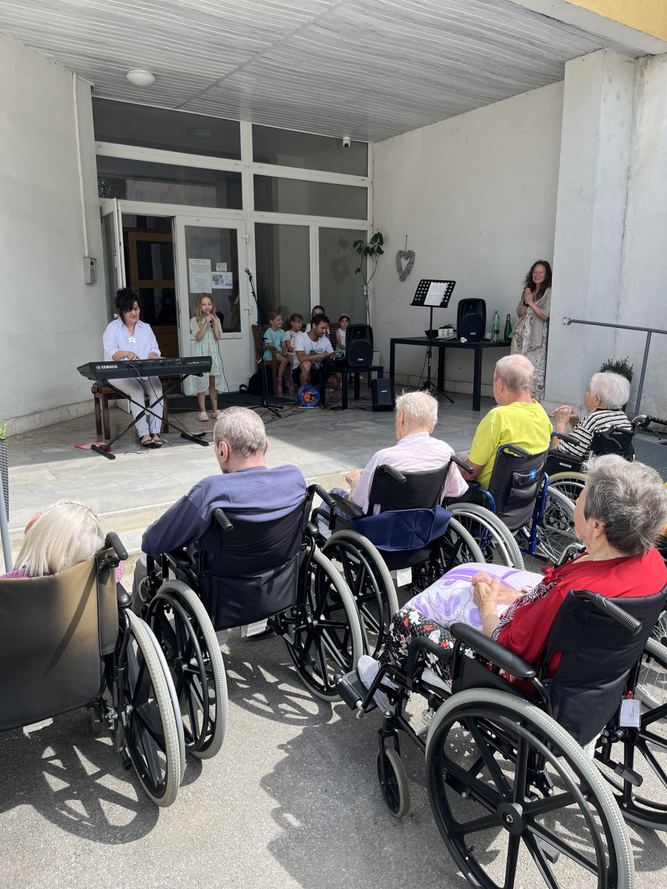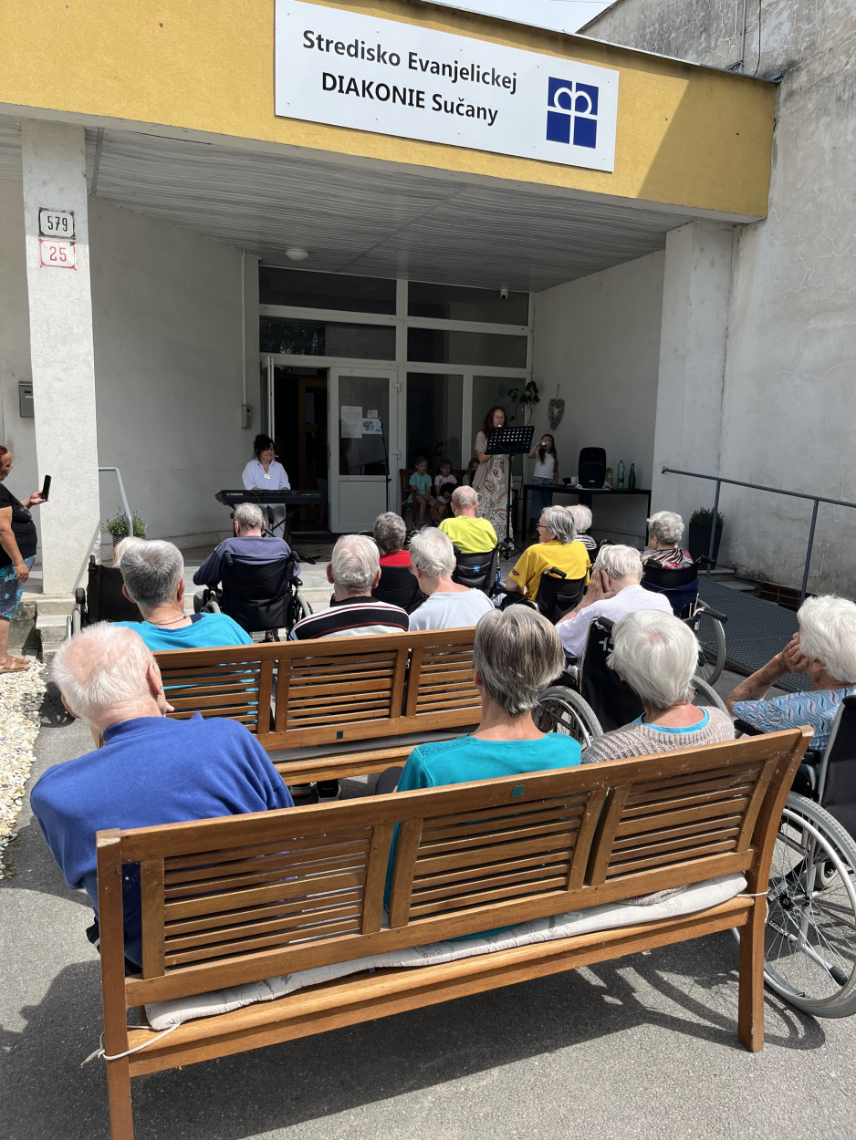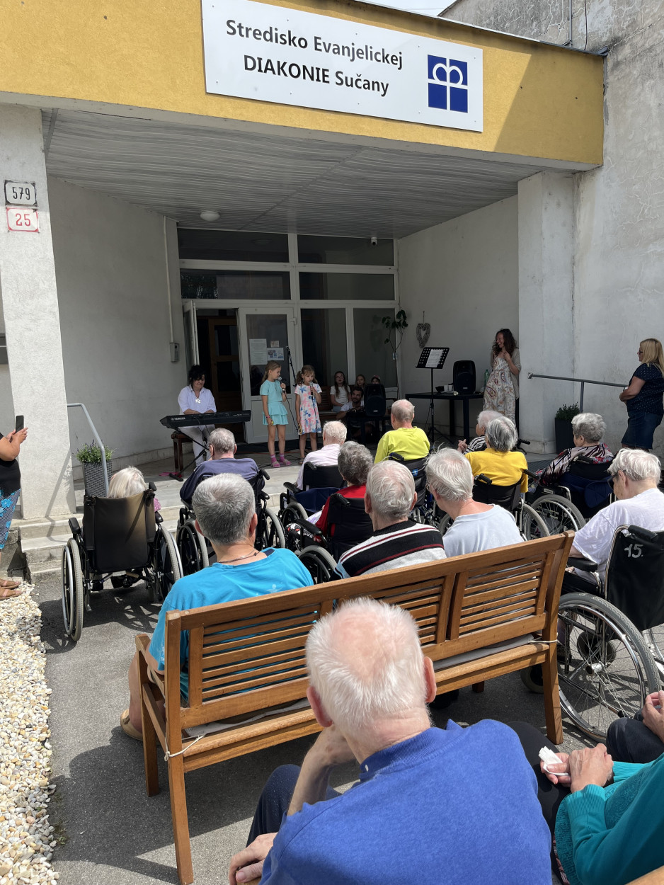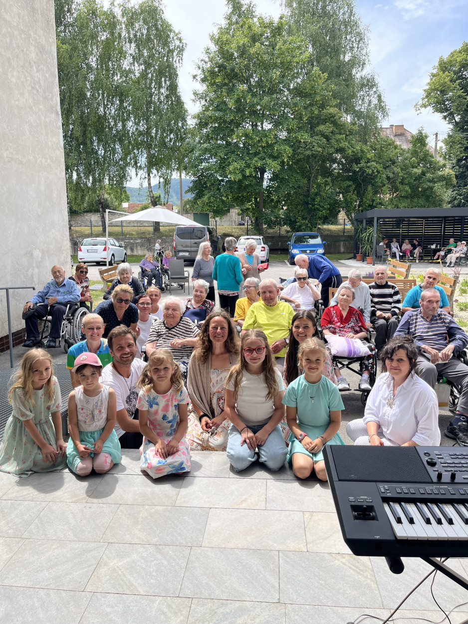 Dňa 23.06.2025 prišli potešiť našich seniorov svojim výnimočným vystúpením talentované deti z “Radostného sveta“ pod vedením Ing. Marice Laščekovej - podporovateľky slobodného prístupu k výchove a vzdelávaniu detí. Je spoluzakladateľkou komunitnej vzdelávacej skupiny Radostný svet. Svojim spevom a nadšením si okamžite získali srdcia seniorov. Talentované dievčatká z OZ Radostný svet si pod vedením pani učiteľky spevu Evy Krajča pripravili krásny hudobný program. Ich spev znel čisto a nežne – niesol v sebe úprimnosť detského sveta a radosť. Atmosféru ešte viac umocnil špeciálny hosť, slovenský spevák a hudobník Juraj Hnilica, ktorý svojim vystúpením prispel k nezabudnuteľnému umeleckému zážitku. Jeho nezameniteľný hlas a obľúbené piesne navodili príjemnú a povznášajúcu atmosféru. Pani Marica Laščeková očarila poslucháčov hrou na flaute. Pripravili si pre nás roztomilé vystúpenie, ktoré nám pohladilo dušu a vyčarilo úsmev na tvári. Ich spev nebol len vystúpením – bol darom. Deti z OZ Radostný svet prišli, lebo túžili potešiť. A my si to úprimne vážime. Priniesli nám svoju bezprostrednosť a radosť z hudby. Spojenie detskej radosti a profesionálneho umenia vytvorilo v našom zariadení skutočne výnimočnú udalosť.